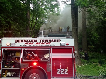 E222 AOS with smoke showing from a 2 story single family dwelling. BC222 established Bensalem command , E222, R4 & E88 placed 2 lines in service and conducted searches, L65 opened up the roof and vented the dwelling. The cause of the fire is under investigation by Bensalem Township Fire Rescue. |